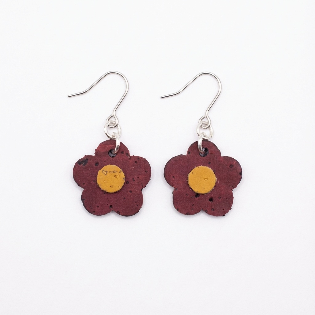 Burgundy Blossom cork dangle earrings. These refined 5-petal flowers in deep burgundy wine tones exude sophisticated warmth, beautifully contrasted by vibrant mustard yellow centers. Handcrafted from sustainable cork fabric with visible natural speckles and texture, each pair tells its own story. The dangle design allows graceful movement that catches the eye without overwhelming. These earrings transition seamlessly from casual gatherings to evening occasions, bringing understated luxury to any ensemble. • Premium vegan cork leather with natural texture